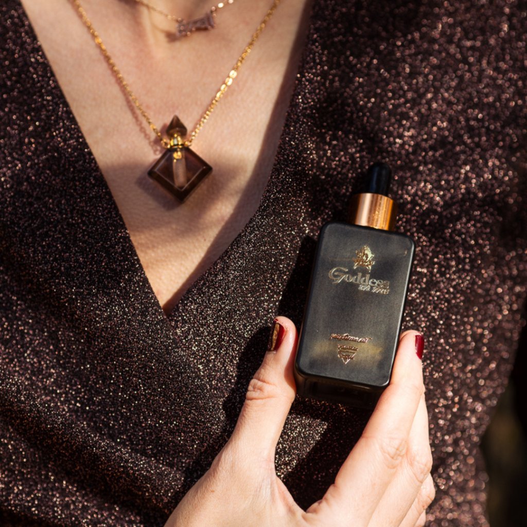 V této vánoční limitované edici ji přinášíme v setu, kde najdeš luxusní olejový parfém ve velikosti 30 ml. Matný, tmavě hnědý flakón se zlatým nápisem, který v rukou působí jako malý oltář krásy a klidu, tě podpoří s tajemnou afirmací na zadní straně. Součástí setu je i provoněná koupelová sůl, která promění běžnou koupel v rituál návratu k sobě, a harmonizační mlha s vůní esence ti pomůže s jemným očistnými záměry během dne. Dále v něm najdeš šperk Gem of Goddess, symbol ženské síly a ochrany, a vykládací karty Bohyně, které tě povedou k odpovědím z nitra.