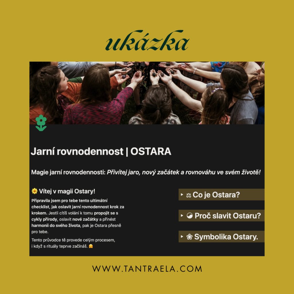 Vstup do období rovnováhy, nových začátků a probouzející se jarní energie. Tento jemný, ale praktický průvodce tě krok za krokem provede oslavou Ostary – seznámí tě se symbolikou svátku, jednoduchými rituály a checklistem, díky kterému se snadno naladíš na cykly přírody a vědomě nastavíš záměry pro další období.