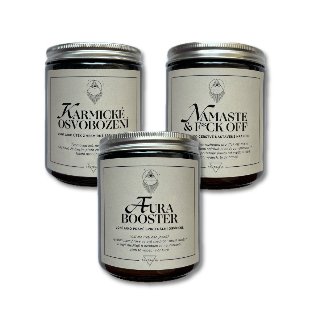 Výhodné balení všech svíček: Aura Booster, Namaste & F*ck off a Karmické osvobození. Tyto svíčky nejen krásně voní, ale posílí i tvůj duchovní rozlet!