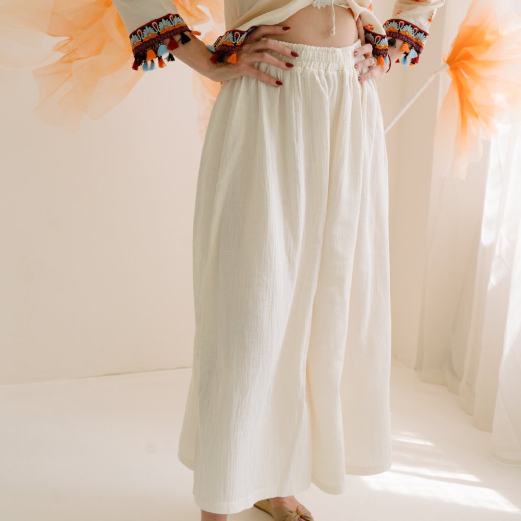 Zapomeň na vymetání chodníku předlouhými kalhoty. Yara jsou lněné kalhoty v délce midi, tedy nad kotníky. Vypadají božsky i když budeš bosky nebo s jemnými podpatky. Je to přesně ten střih, u kterého si okolí není na stopro jisté, zda máš kalhoty nebo sukni, jsi paní tajemná. Mají pohodlný střih a vyšší pas. Ecru odstín dává volnost stylizaci – ať už zvolíš košili, tílko nebo crop top, budeš vypadat elegantně a přirozeně.