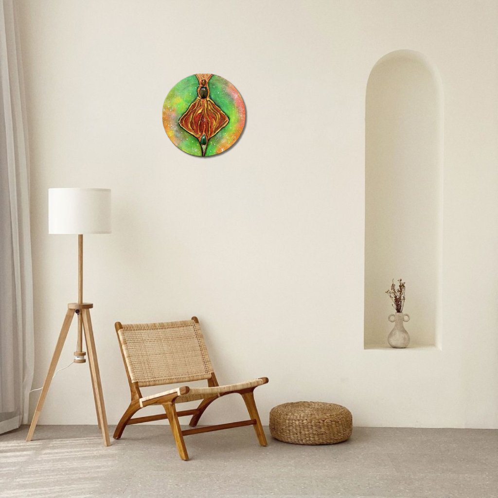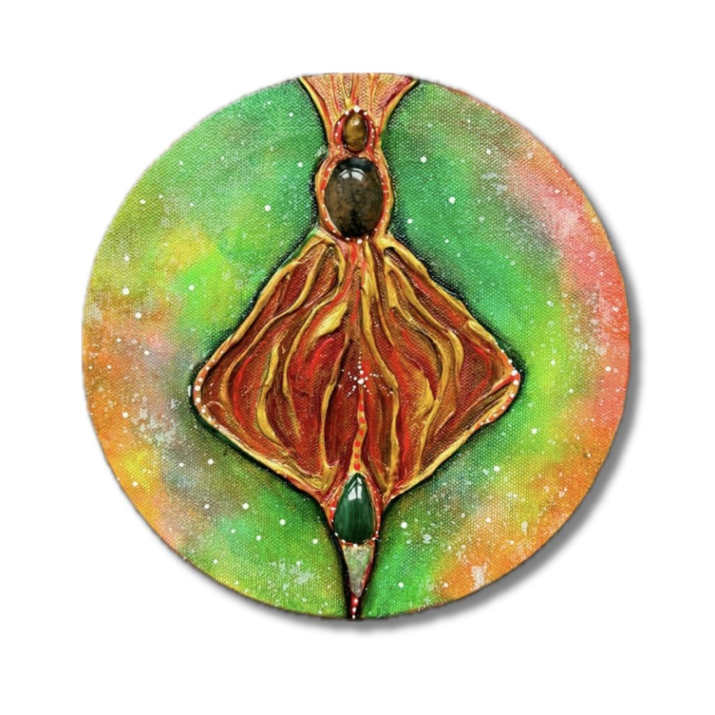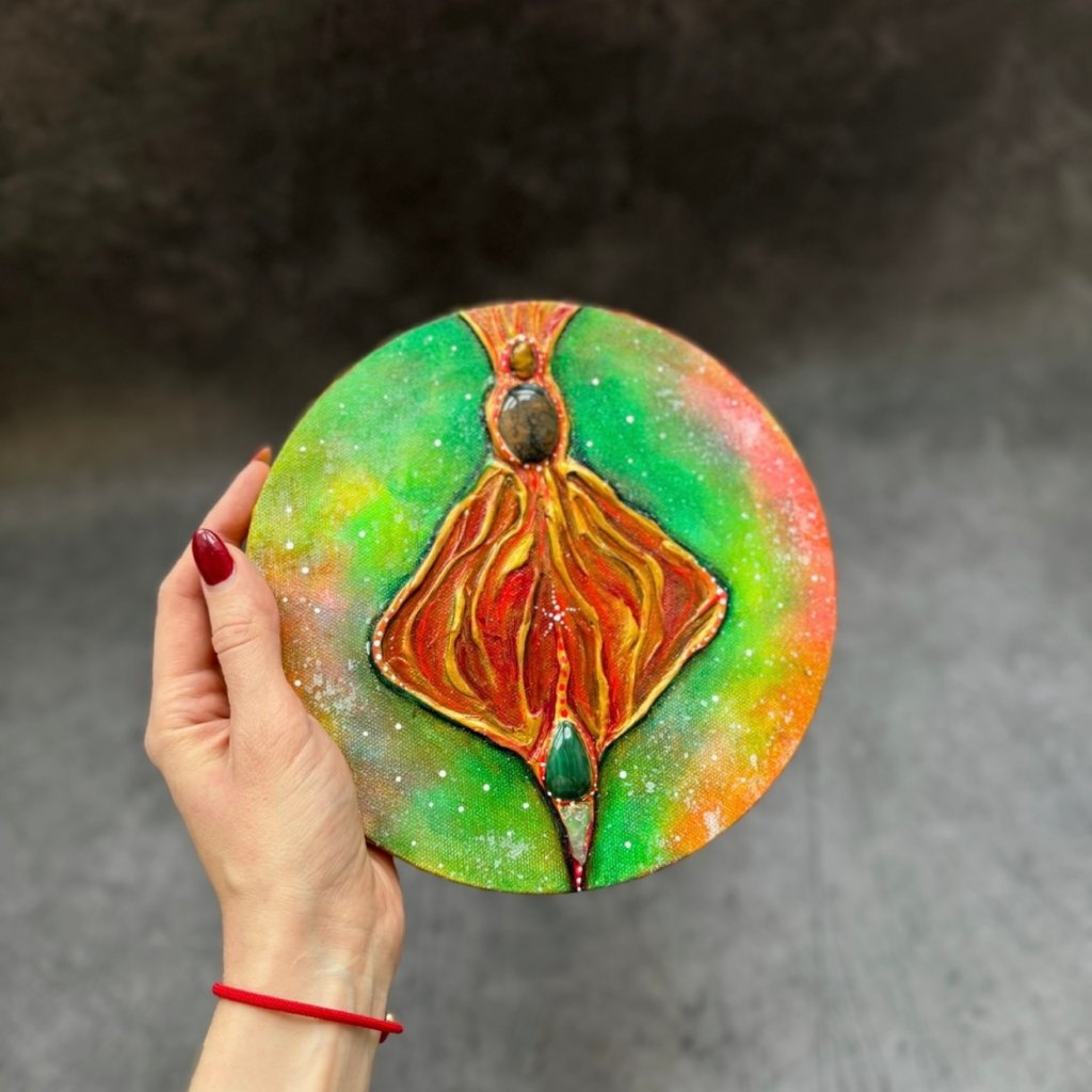 Yoni Přijetí je oslavou přijetí sebe sama a propojení s přírodou. Obraz s jarními barvami symbolizuje růst, obnovu a regeneraci. Kameny zasazené v obrazu – tygří oko, amazonit, dračí achát a dušový kámen – podporují sílu, odvahu a uzemnění. Tento obraz ti pomůže přijmout svou vlastní cestu, své cykly a proměny s láskou a úctou k sobě samé. Je jako přítel, který tě vede k hlubšímu porozumění a přijetí tvé jedinečnosti.