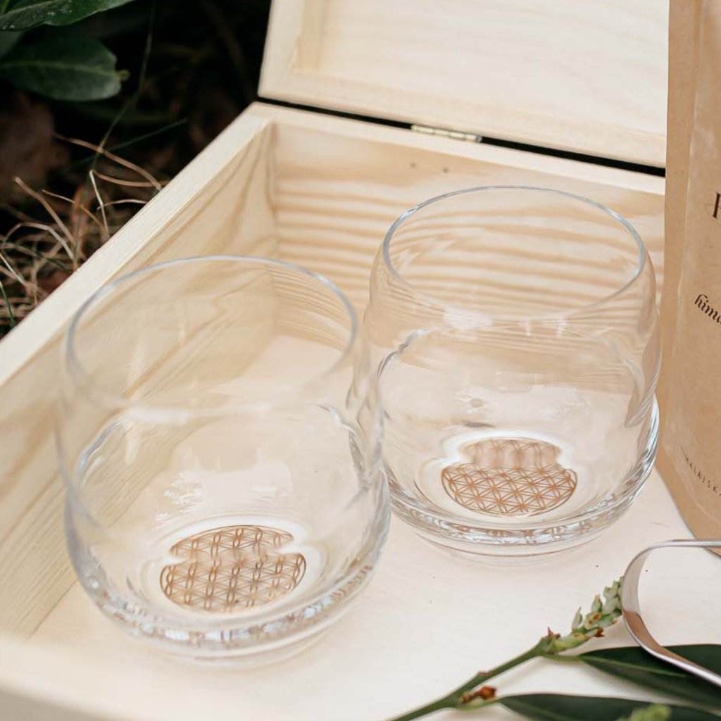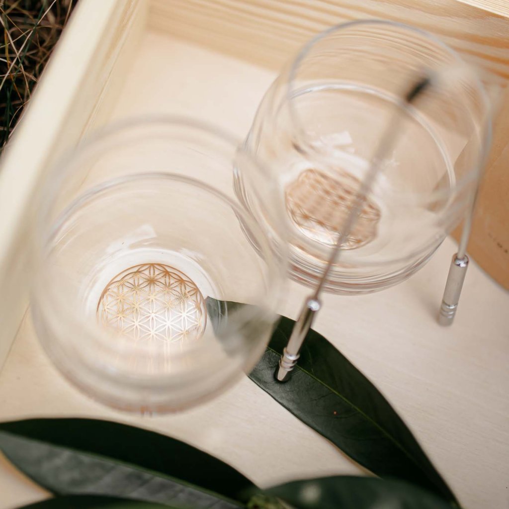 - Na dně každé sklenice je vypálený symbol Květ života z 24k zlata – silný energetizující prvek s tisíciletou tradicí